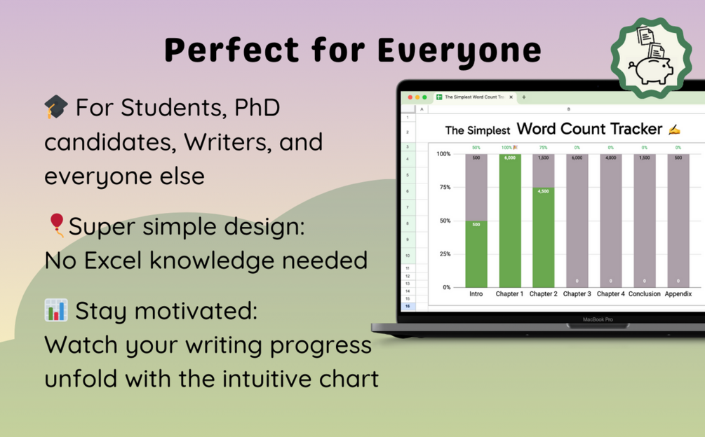 Struggling to see your writing progress? Say hello to simplicity with our easy-to-use Google Sheets template! Whether you're a student, a PhD candidate, or a writer embarking on your next masterpiece, our tracker is your trusty companion.