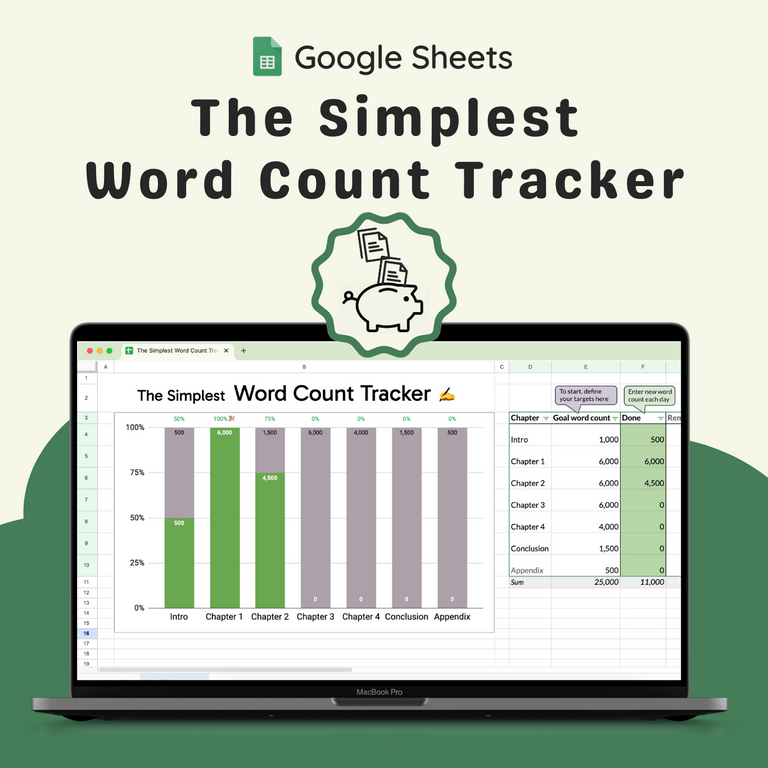 Set your word count goals, log your daily progress, and watch your writing journey come to life with visual charts. No spreadsheet expertise needed – Start your journey today!