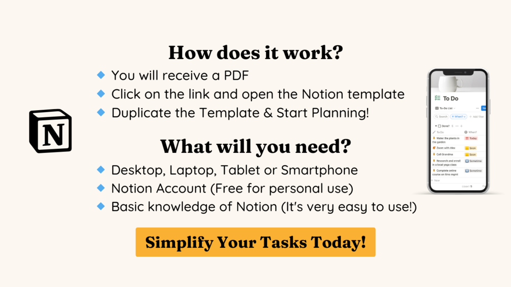 Meet 'The Simplest To-Do List' - your new companion for stress-free task management on Notion! With an easy-to-use interface, this template simplifies your daily planning. Mark and unmark tasks effortlessly, use the 'Mark all as Done' and 'Uncheck all' buttons for swift editing. Choose from three intuitive priority/timing options, reflecting your natural task management style. Add optional notes or set deadlines with notifications for seamless organization. Make task management a breeze with our fun and simple product! π